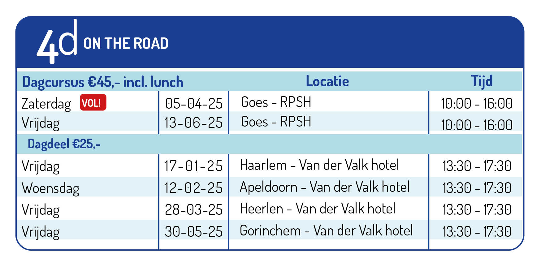 Plaatsen zijn beperkt dus meld je direct aan voor een van de volgende bijeenkomsten: