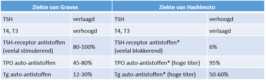 Bij de auto-immuunaandoeningen ziekte van Graves (hyper) en Hashimoto (hypo), worden antistoffen tegen de schildklier aangemaakt, anti-TPO en anti-Tg.